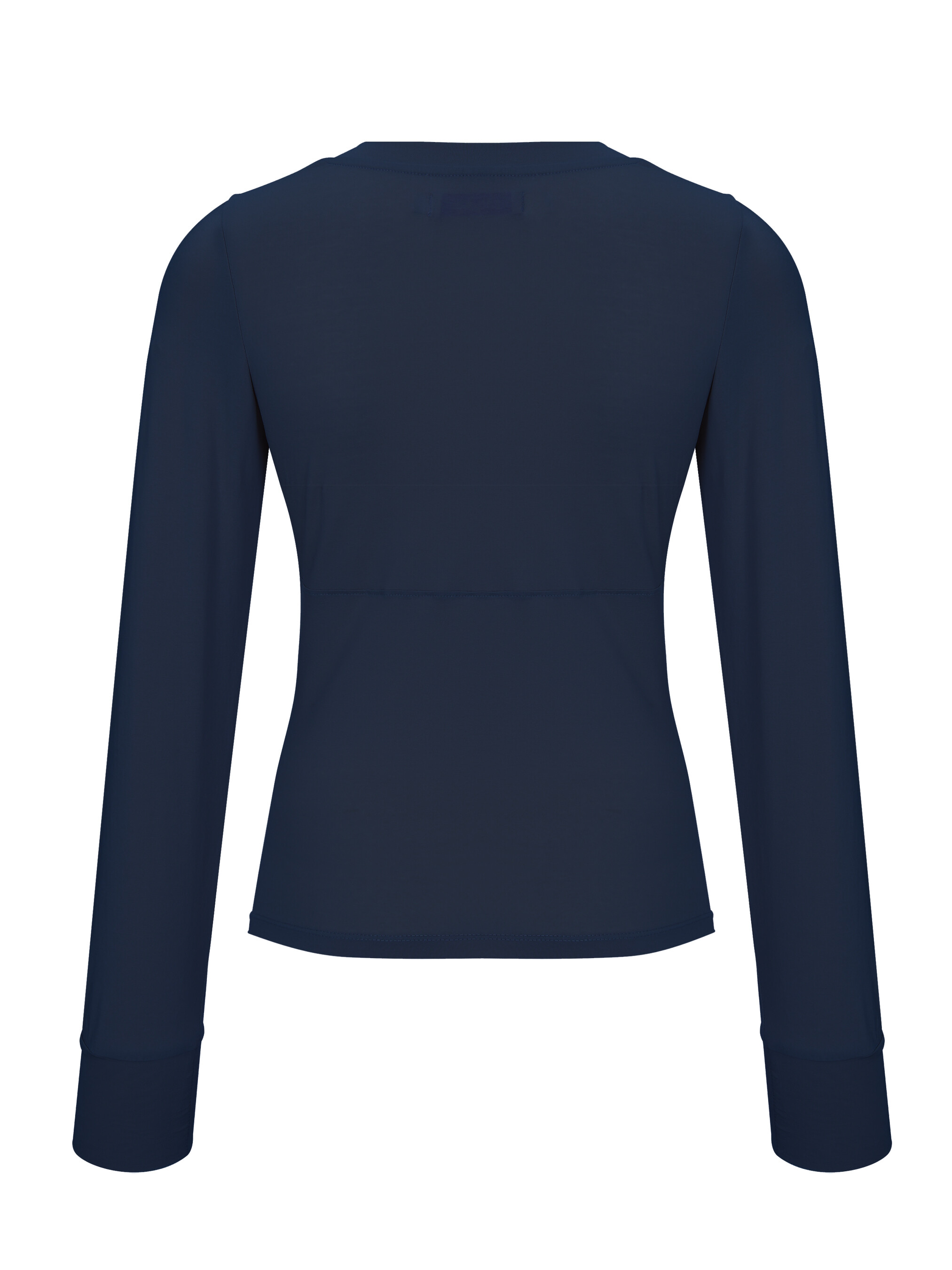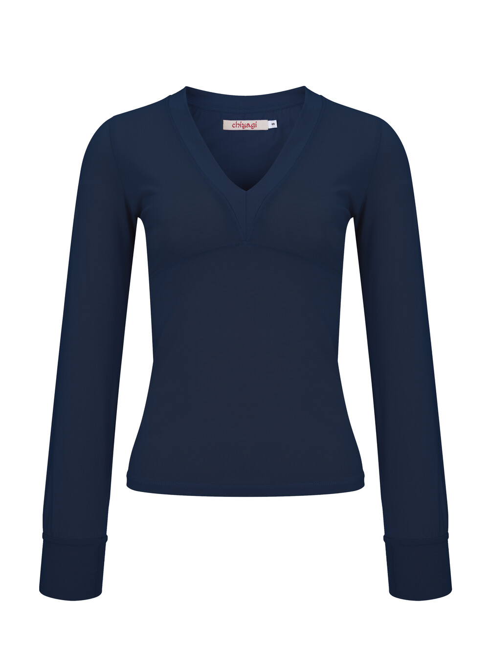 A top featuring a narrow and deep V-neck shape and distinctive front panel design. The voluminous sleeves and wide cuffs highlight a classic and elegant nuance.