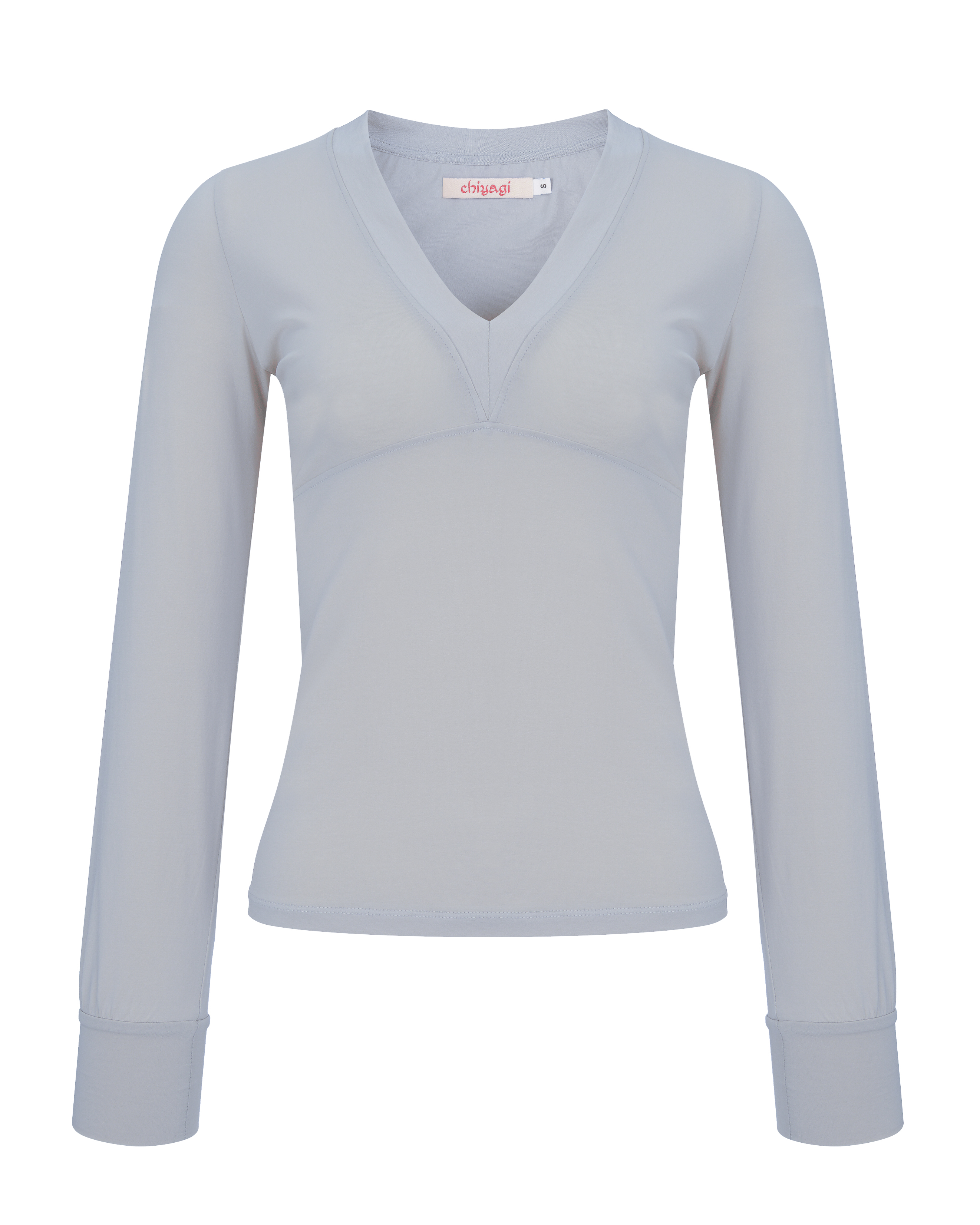 A top featuring a narrow and deep V-neck shape and distinctive front panel design. The voluminous sleeves and wide cuffs highlight a classic and elegant nuance.