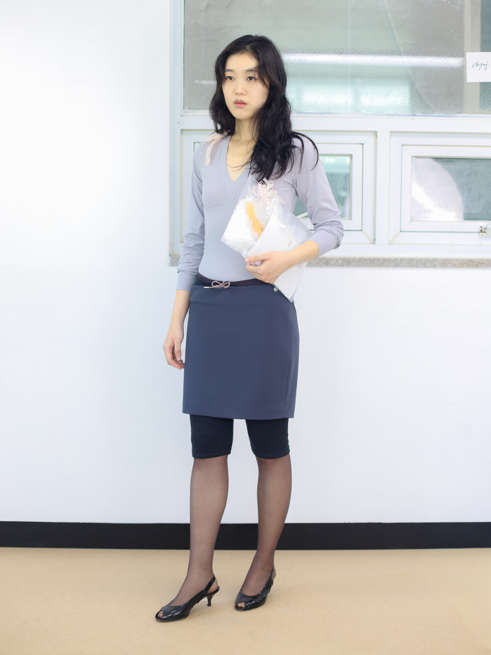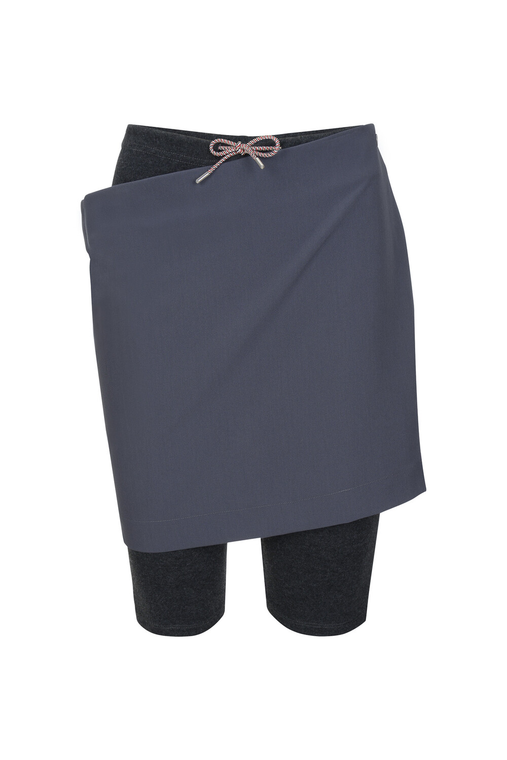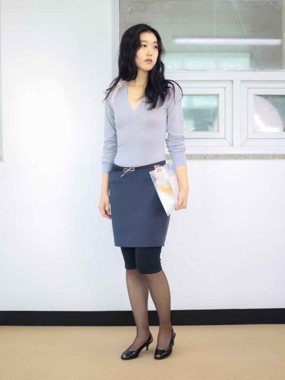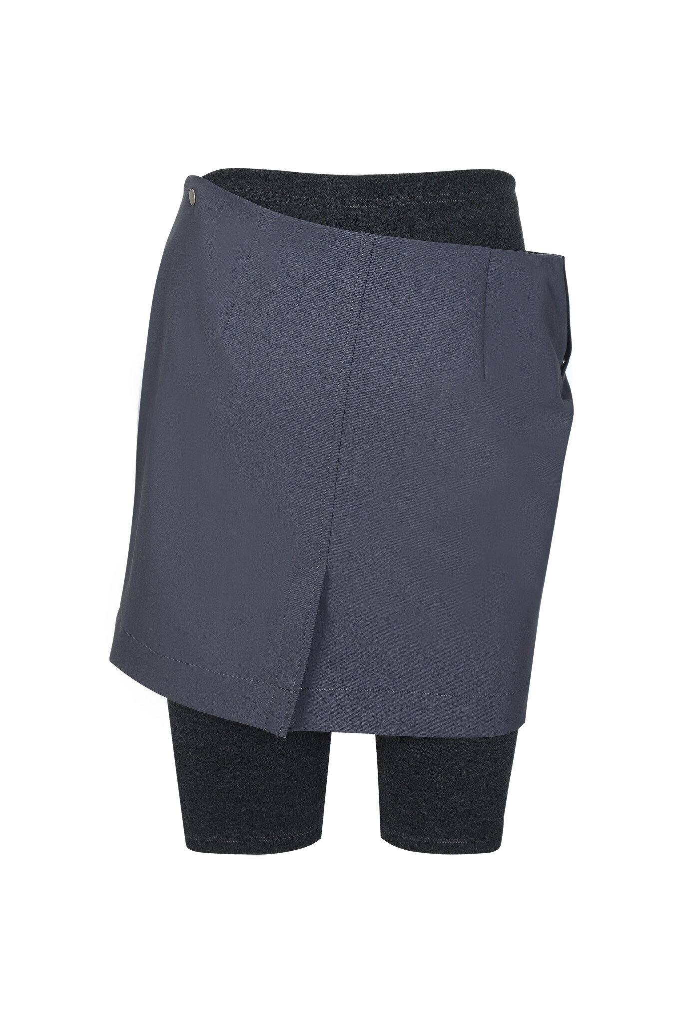 A design combining an office-style H-line skirt and leggings into a single piece. The slightly oversized H-line skirt, which sits loosely at the waist, can be attached or detached from the leggings using two snaps on the left side.