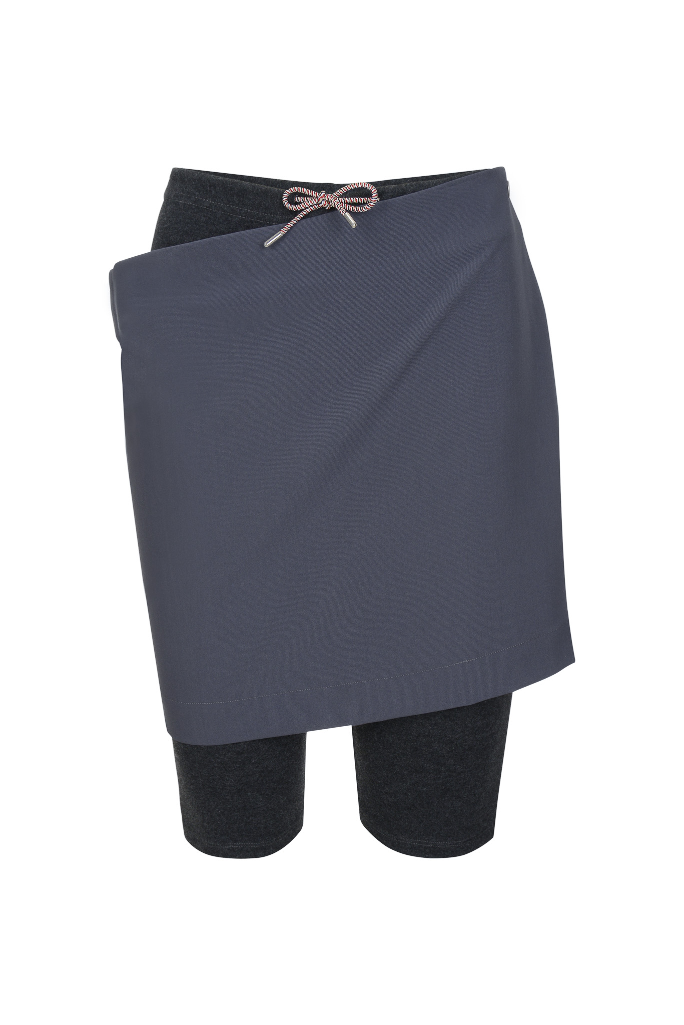 オフィススタイルのHラインスカートとレギンスパンツが一体になったデザイン。ややゆったりとしたウエストのHラインスカートは、左側の2つのスナップでレギンスと着脱できる仕様です。