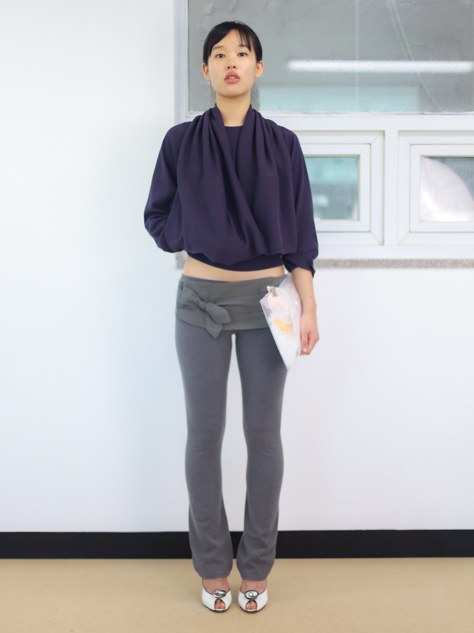 セミフレアフィットで作られたレギンスパンツ。単品で着用する場合は、ウエスト下でエプロンのように結んで着用できます。ボトムスの内側にレイヤードして着用する場合は、ウエストがタイトにフィットし、ベルトのみを見せるスタイリングバリエーションが意図されています。