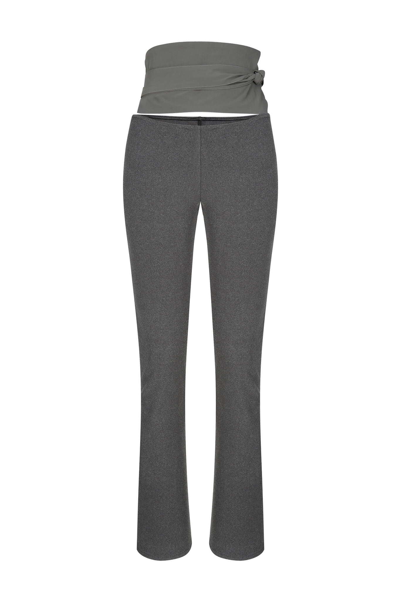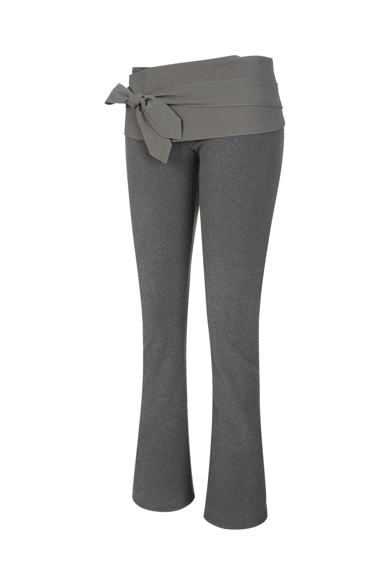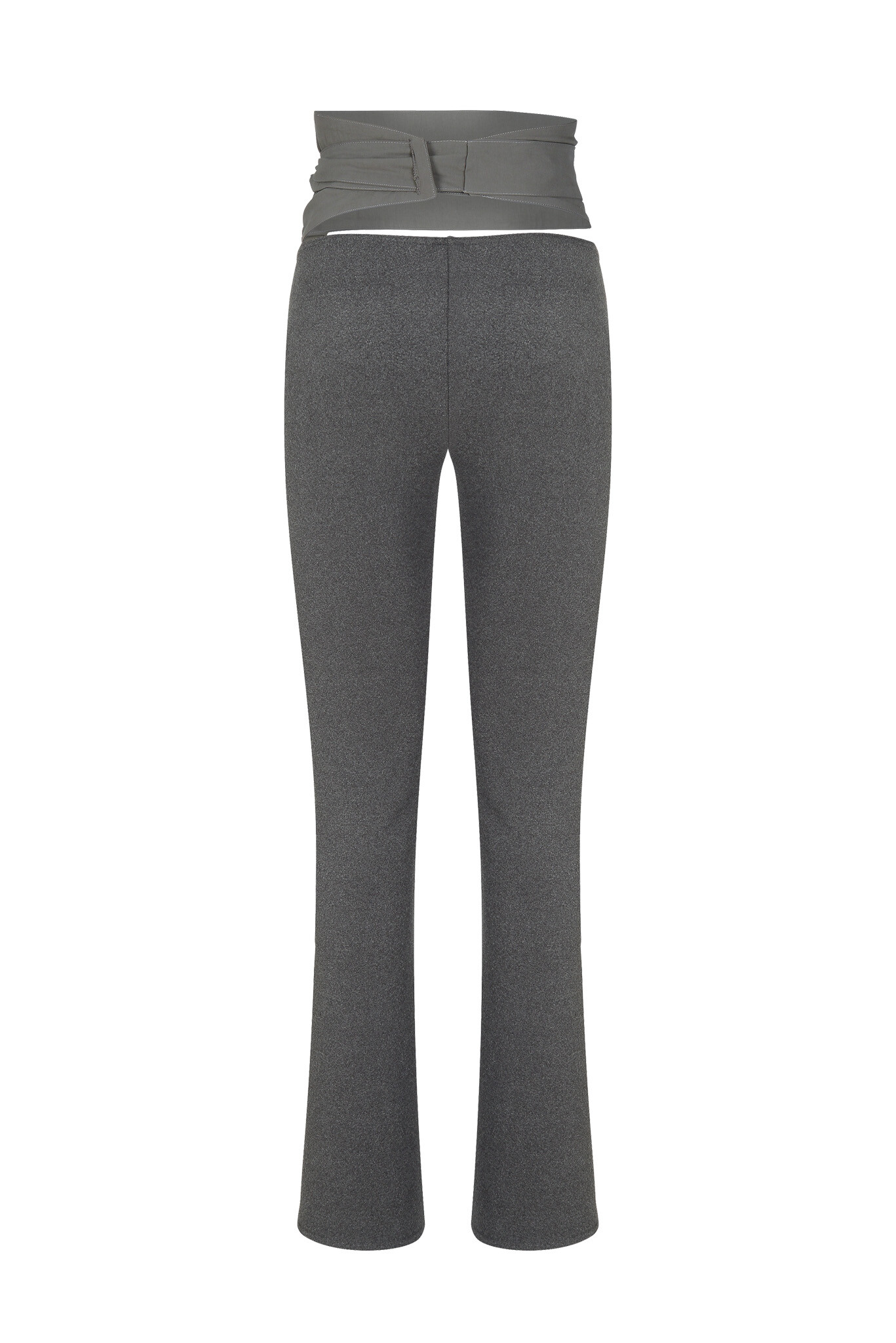 Legging pants made in a semi-flare fit. When worn alone, they can be tied below the waist like an apron. When layered inside another bottom, the waistband fits snugly, allowing only the belt to be exposed, offering a styling variation as intended.