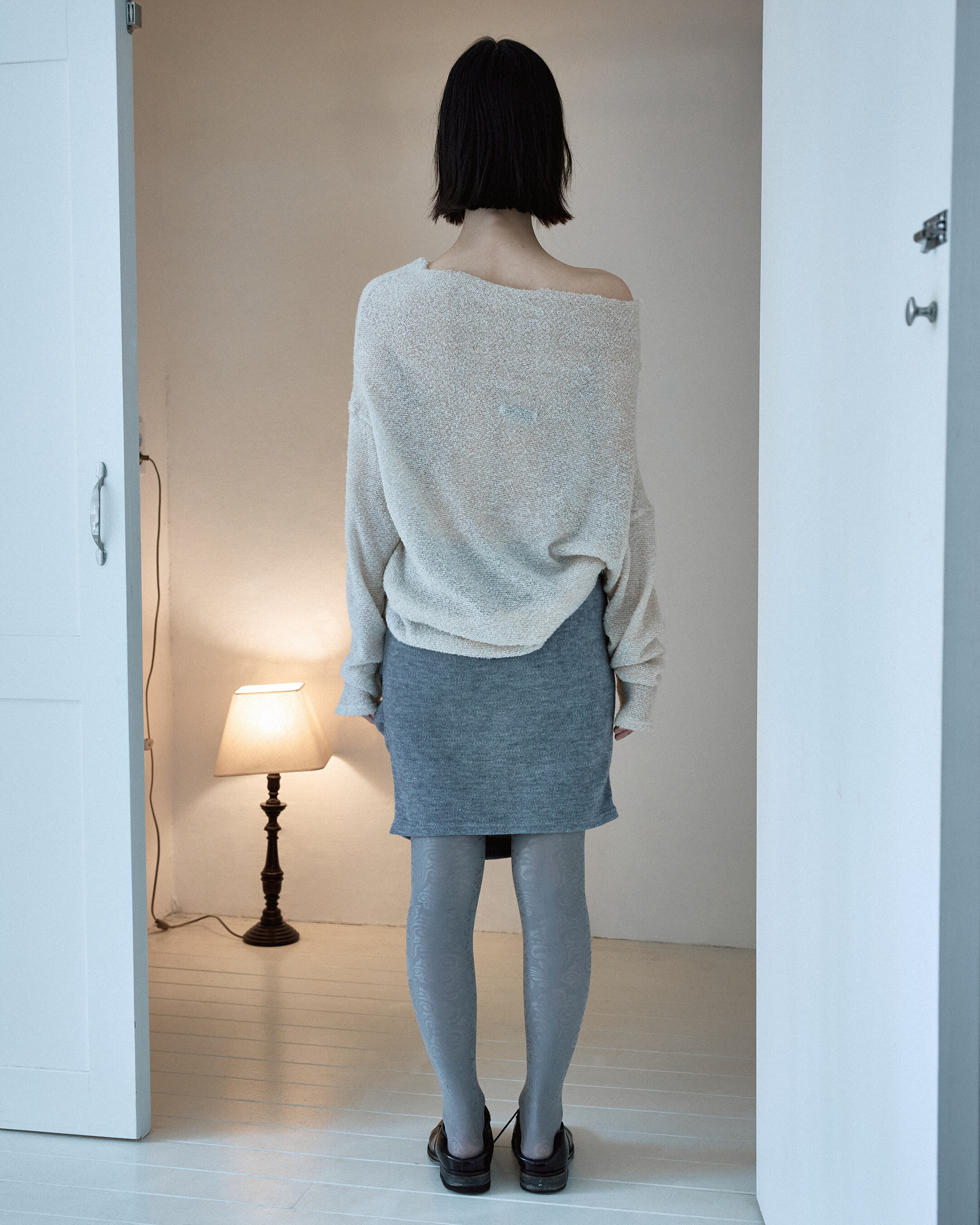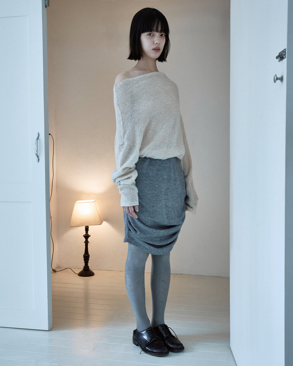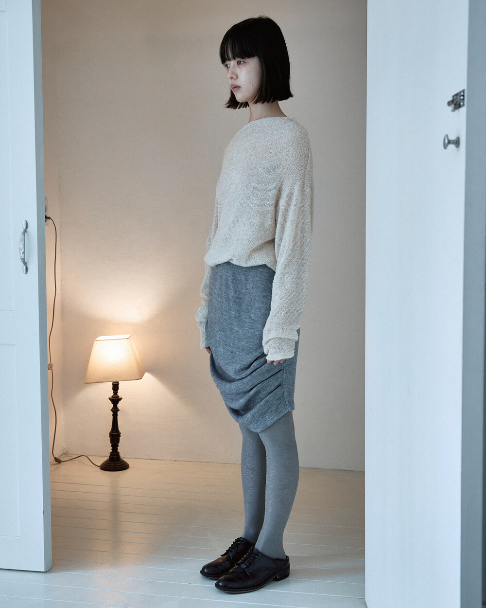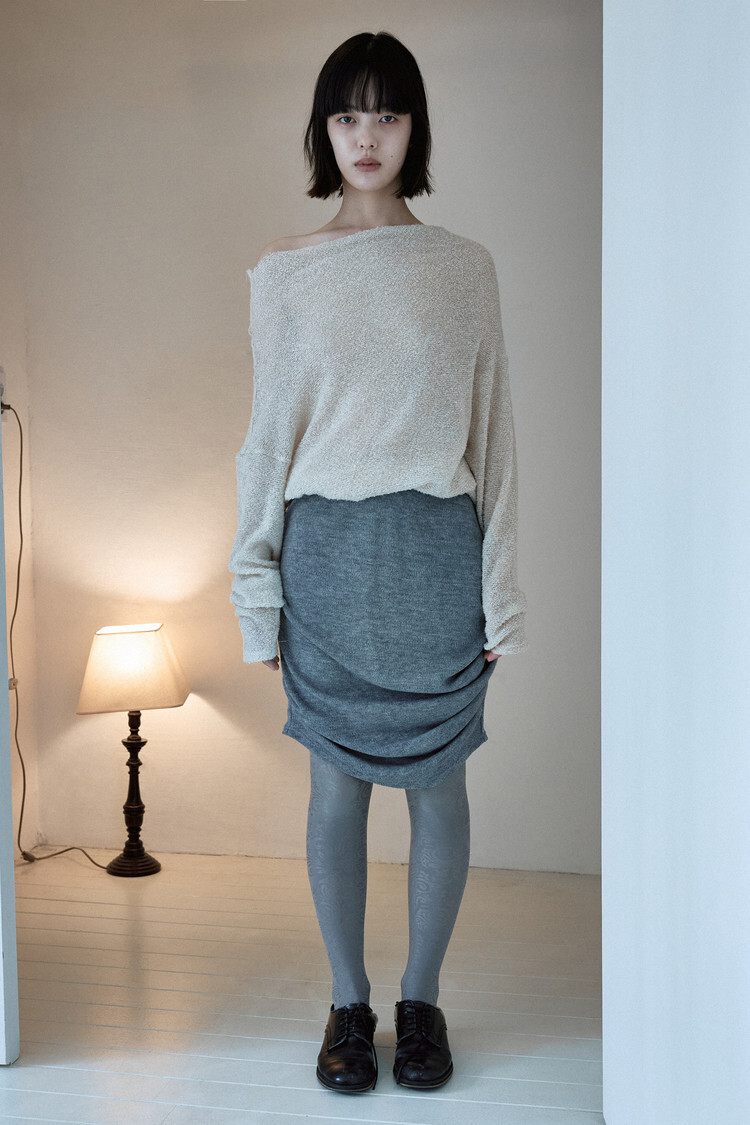 ∙ 니트 소재로 제작된 많은 볼륨의 셔링 디자인의 스커트로 앞면 부분이 자연스럽게 여러 겹의 주름으로 잡혀 풍성하고 페미넌한 실루엣으로 연출됩니다.