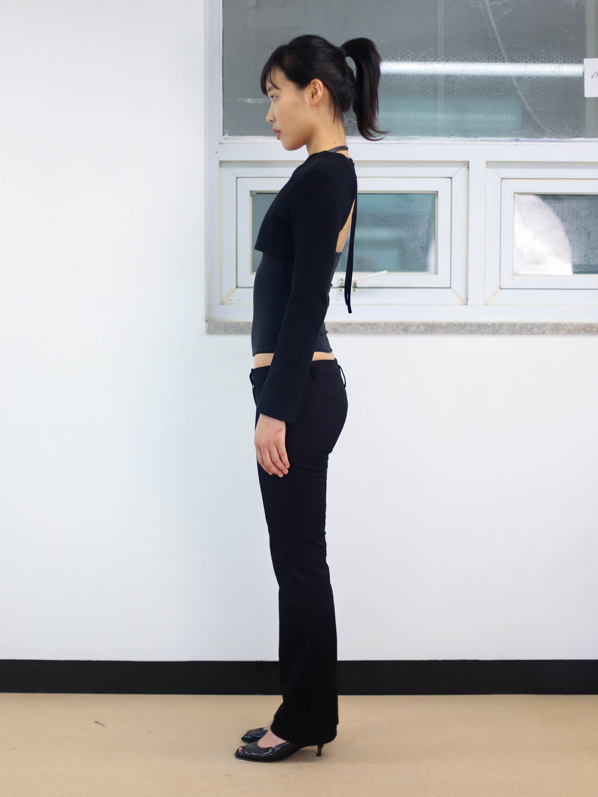 A bolero top made with double-layered fabric. The inner bottom button and adjustable back strap allow for a fitted silhouette.
