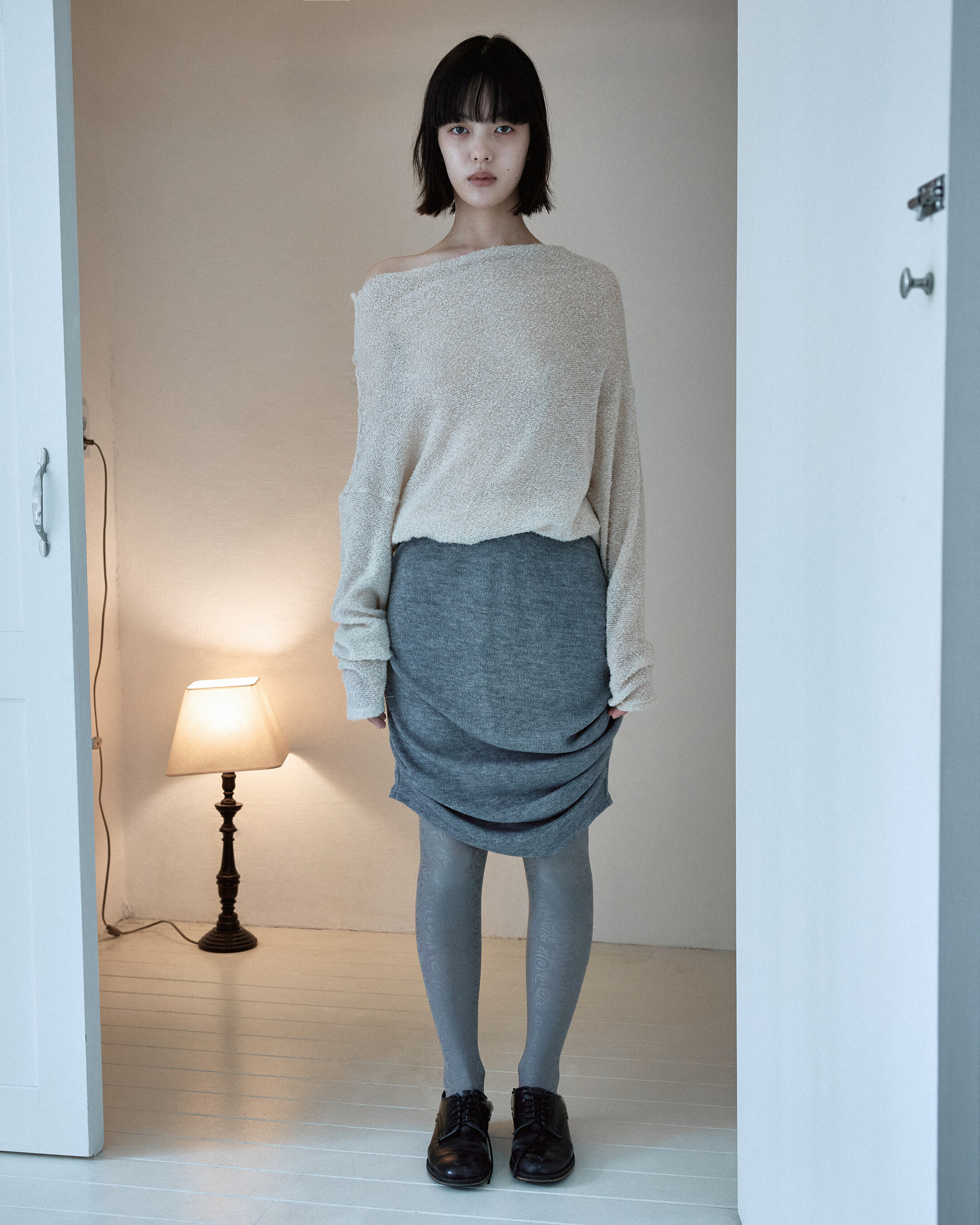 ∙ 니트 소재로 제작된 많은 볼륨의 셔링 디자인의 스커트로 앞면 부분이 자연스럽게 여러 겹의 주름으로 잡혀 풍성하고 페미넌한 실루엣으로 연출됩니다.
