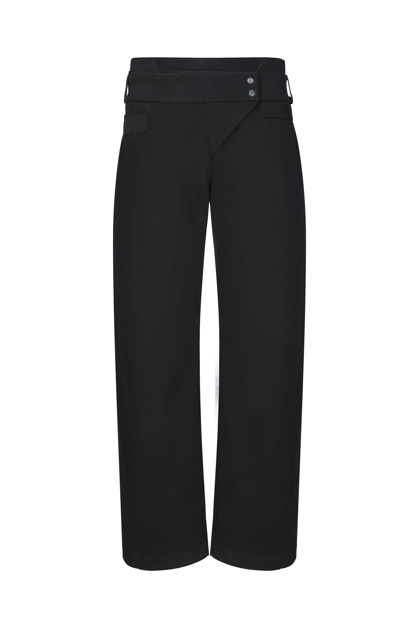 Semi low-rise tapered pants. The slightly raised waistband panel is designed to balance the appearance of a short rise. Features include an adjustable back buckle, a front panel with a pleat, a left front pocket, and side pockets on both sides.