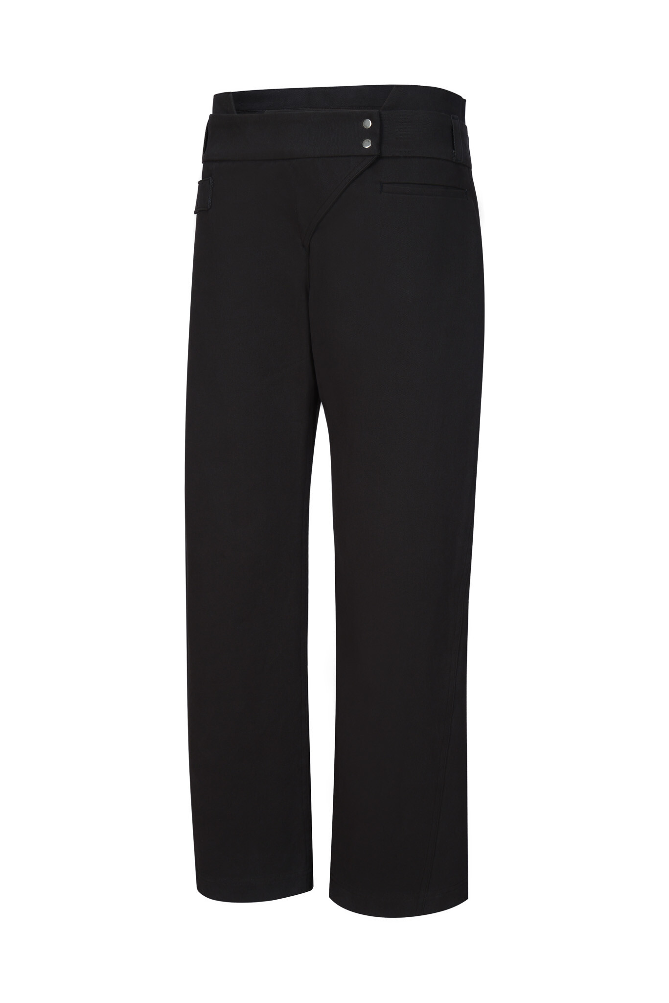 セミローライズのテーパードパンツ。やや高めに設計されたウエストパネルが、ショートライズの印象を和らげるよう意図されています。背面のサイズ調整用バックル、フロントのプリーツパネル、左前ポケット、両サイドのポケットディテールが備わっています。
