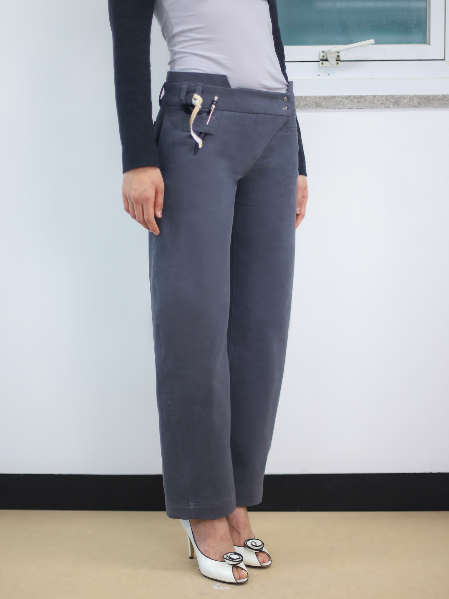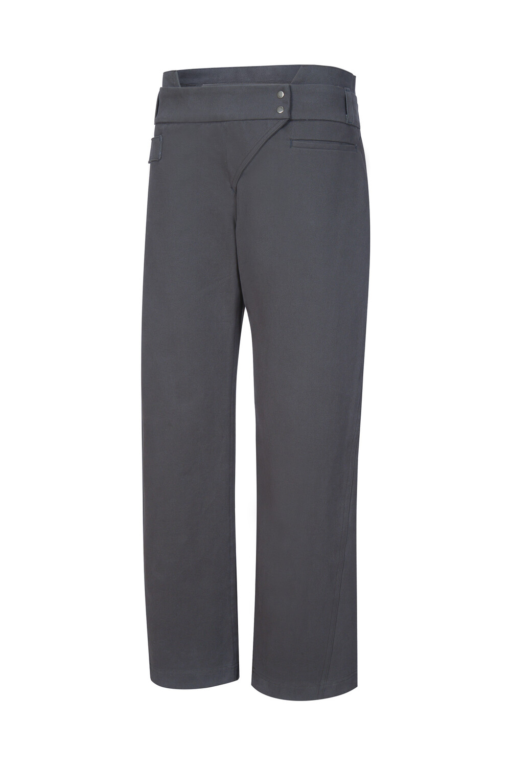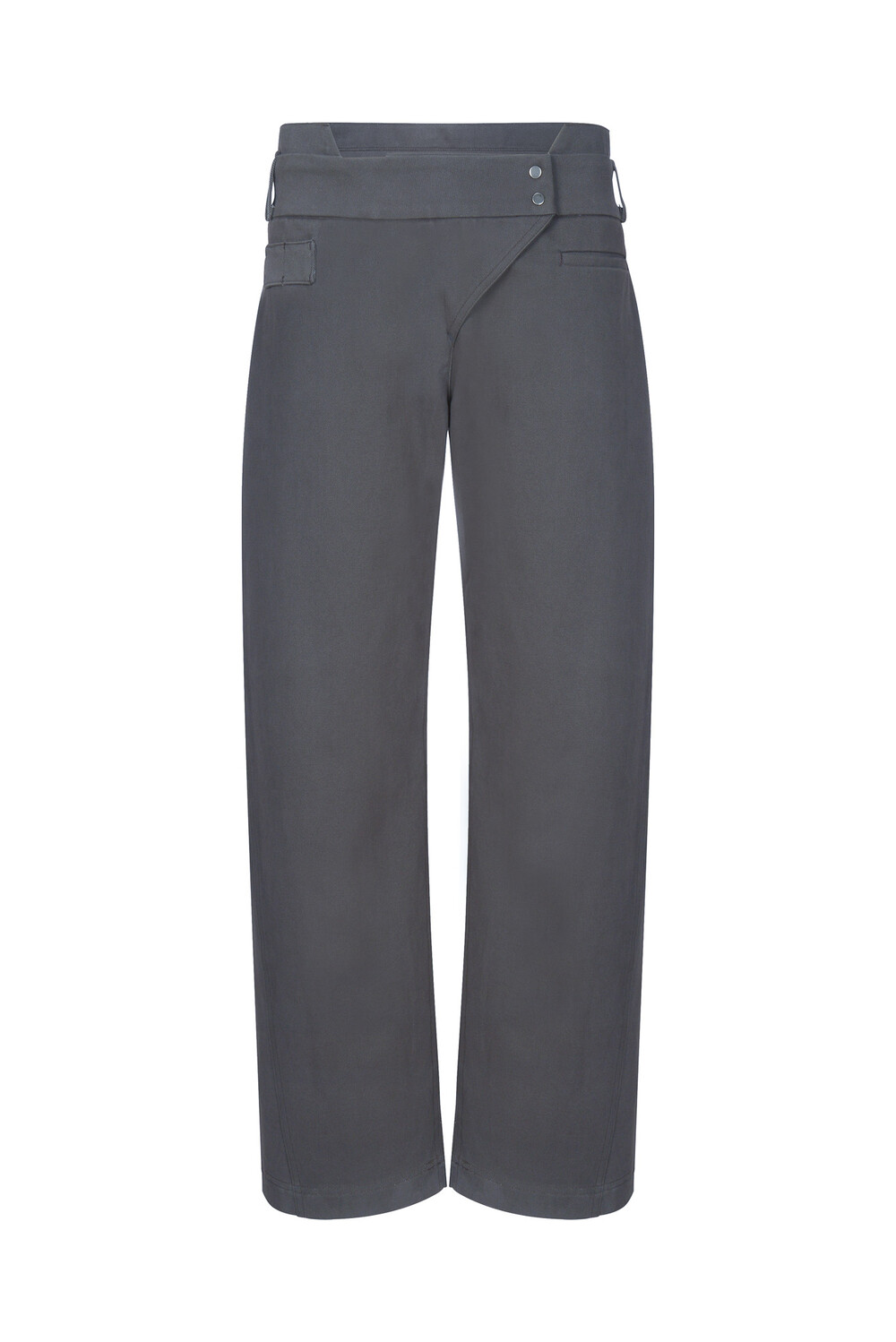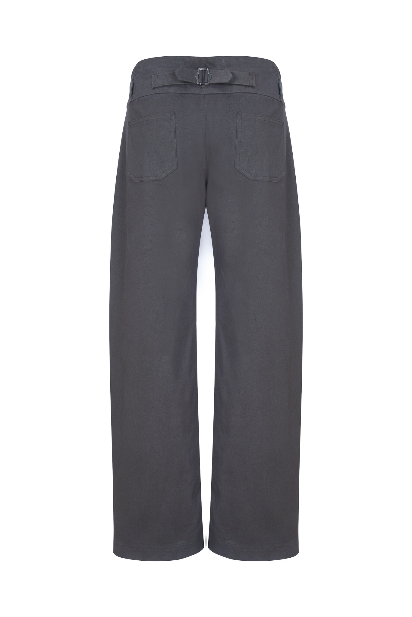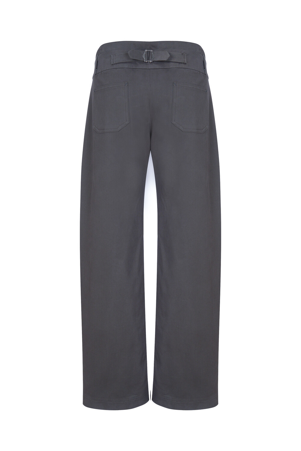 セミローライズのテーパードパンツ。やや高めに設計されたウエストパネルが、ショートライズの印象を和らげるよう意図されています。背面のサイズ調整用バックル、フロントのプリーツパネル、左前ポケット、両サイドのポケットディテールが備わっています。